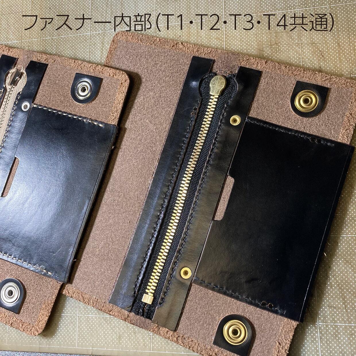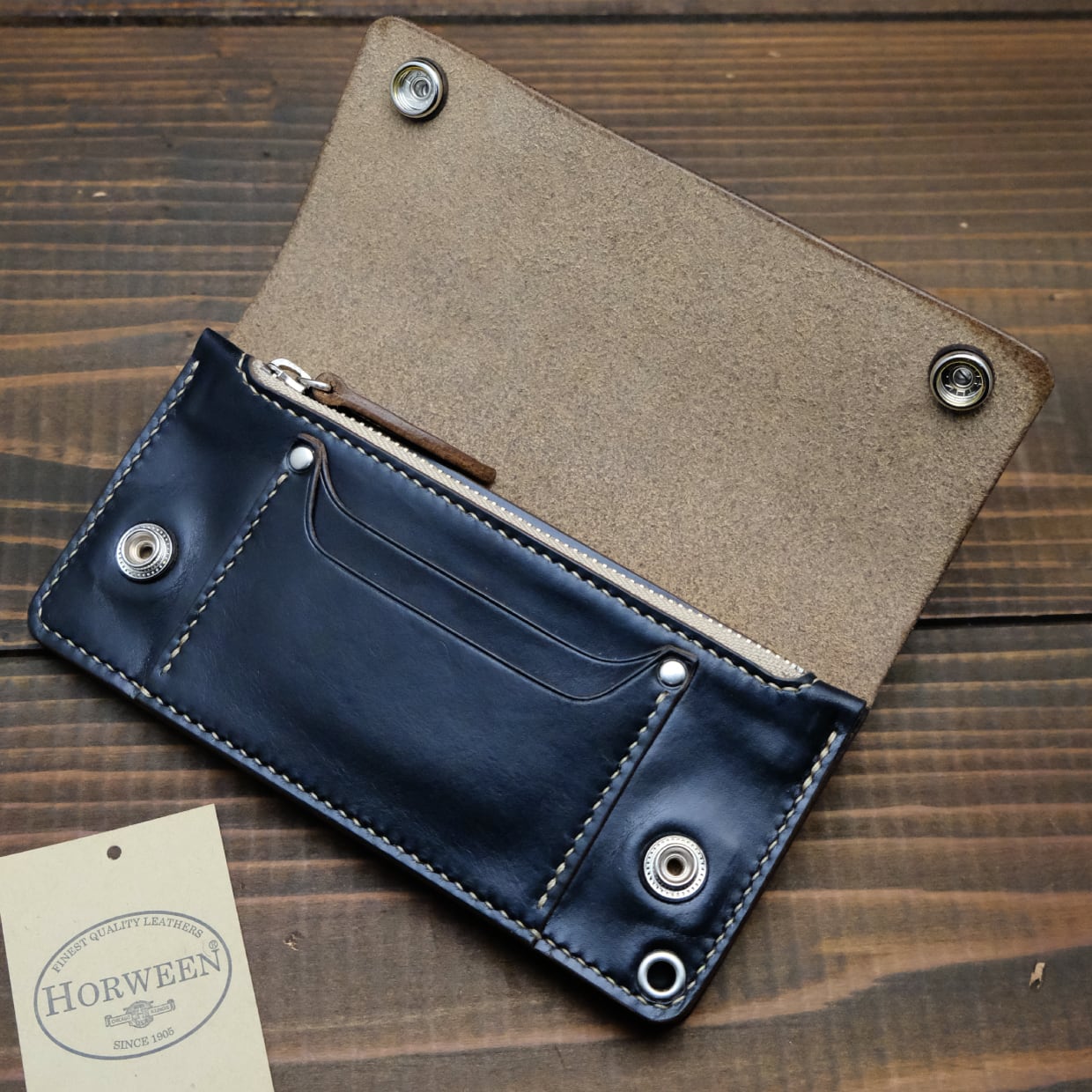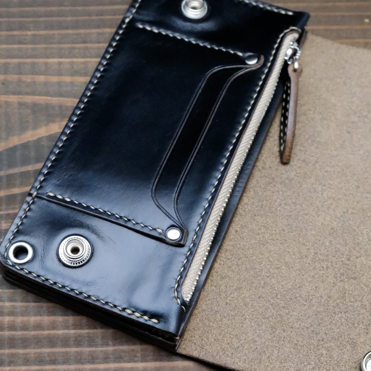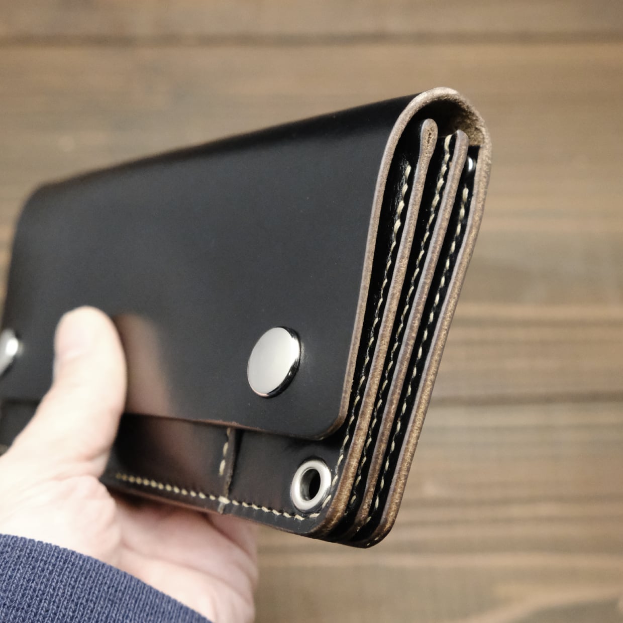 トラッカーウォレット T3は、フロントダブルカード、札入れの間にも勿論2箇所のポケットがあり、使いやすい手縫いトラッカーウォレットです
