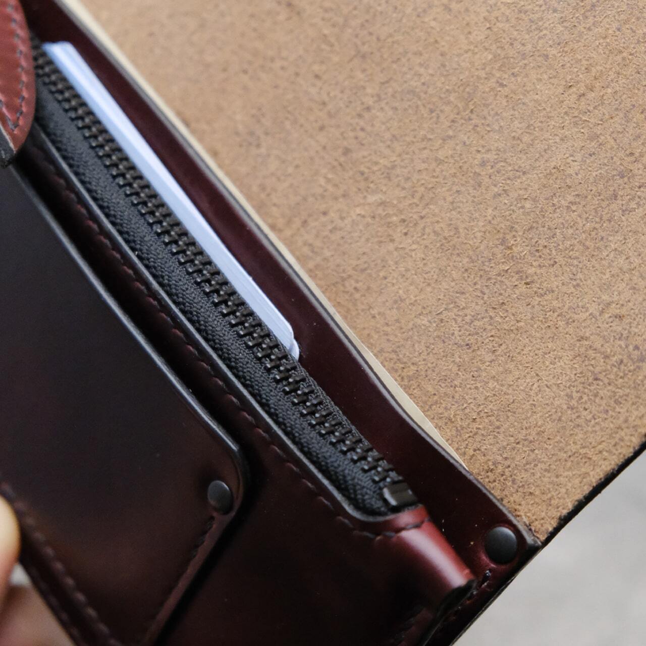 カードが全面収まるフロントカードポケットは、左右上端が少々可動しますのでカードの出し入れがしやすいです。