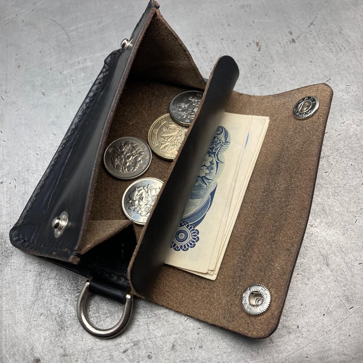 二つ折りにしたお札を入れ、フロントポケットにこれ一つでOK!ラフで無骨なミニトラッカーウォレットです。もちろんセカンド財布にも便利!