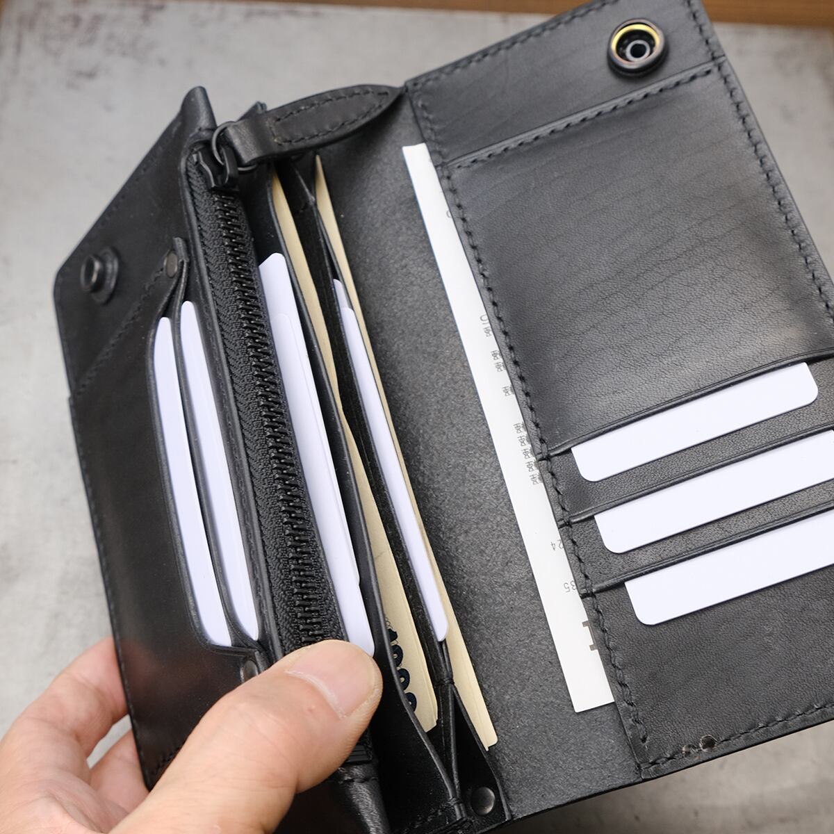 外観はワイルドでありながら、整然と収納できるトラッカーウォレットです。